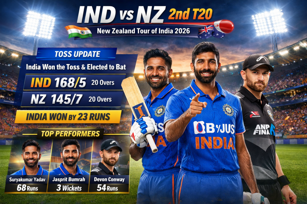 India vs New Zealand 2nd T20I рдЖрдЬ Shaheed Veer Narayan Singh International Stadium, Raipur рдореЗрдВ рдЦреЗрд▓рд╛ рдЬрд╛ рд░рд╣рд╛ рд╣реИредрдореИрдЪ рдХрд╛ рд╕рдордп: 7:00 PM ISTрдЯреЙрд╕ рд╕рдордп: 6:30 PM ISTрд╕реАрд░реАрдЬрд╝: New Zealand Tour of India 2026рднрд╛рд░рдд рдкрд╣рд▓реЗ T20 рдореЗрдВ рдЬреАрдд рд╣рд╛рд╕рд┐рд▓ рдХрд░ рд╕реАрд░реАрдЬрд╝ рдореЗрдВ 1тАУ0 рдХреА рдмрдврд╝рдд рд▓реЗ рдЪреБрдХрд╛ рд╣реИред рдЖрдЬ рдХреЗ рджреВрд╕рд░реЗ рдореИрдЪ рдореЗрдВ рдЯреАрдо рдЗрдВрдбрд┐рдпрд╛ рдХреА рдирдЬрд╝рд░ рд╕реАрд░реАрдЬрд╝ рдореЗрдВ рдмрдврд╝рдд рдмрдирд╛рдиреЗ рдкрд░ рд╣реИредЁЯкЩ Toss UpdateToss: India won the toss and chose to bat first.рднрд╛рд░рдд рдиреЗ рдЯреЙрд╕ рдЬреАрддрдХрд░ рдкрд╣рд▓реЗ рдмреЙрд▓рд┐рдВрдЧ рдХрд╛ рдирд┐рд░реНрдгрдп рд▓рд┐рдпрд╛редЁЯПП Match Score / ResultScore Update: India 209(3)New Zealand: 206(6)Result: update india won by 7 wicketрдЯреАрдо рдЗрдВрдбрд┐рдпрд╛ рдХреА рд╢рд╛рдирджрд╛рд░ рдмрд▓реНрд▓реЗрдмрд╛рдЬреА рдФрд░ рддреЗрдЬ рдЧреЗрдВрджрдмрд╛рдЬрд╝реЛрдВ рдХреА рджрдорджрд╛рд░ рдЧреЗрдВрджрдмрд╛рдЬрд╝реА рдиреЗ рдореИрдЪ рдХреЛ рд░реЛрдорд╛рдВрдЪрдХ рдмрдирд╛рдпрд╛редЁЯМЯ Top Performersрд╕реБрдкрд░ рд╕реНрдЯреНрд░рд╛рдЗрдХрд░: Suryakumar YadavрдмреЗрд╕реНрдЯ рдмреЙрд▓рд░: Jasprit BumrahрдиреНрдпреВрдЬрд╝реАрд▓реИрдВрдб рдореЗрдВ рдЪрдордХреЗ: Devon ConwayЁЯУ║ Watch Live / Streaming. TV: Star Sports / DD SportsOnline Streaming: JioCinema / JioTV Post navigation ЁЯз╛ PAN Card Update 2026: рдирдпрд╛ рдирд┐рдпрдо, рдСрдирд▓рд╛рдЗрди рдЖрд╡реЗрджрди, рд╕реНрдЯреЗрдЯрд╕ рдЪреЗрдХ тАУ рдкреВрд░реА рдЬрд╛рдирдХрд╛рд░реА рд╣рд┐рдВрджреА рдореЗрдВ